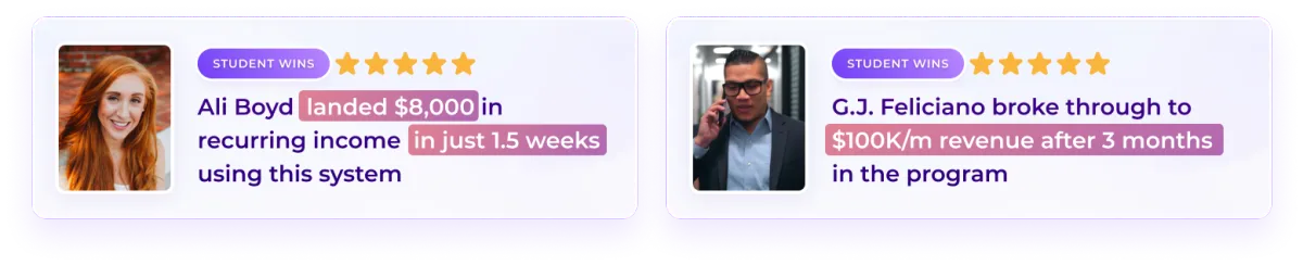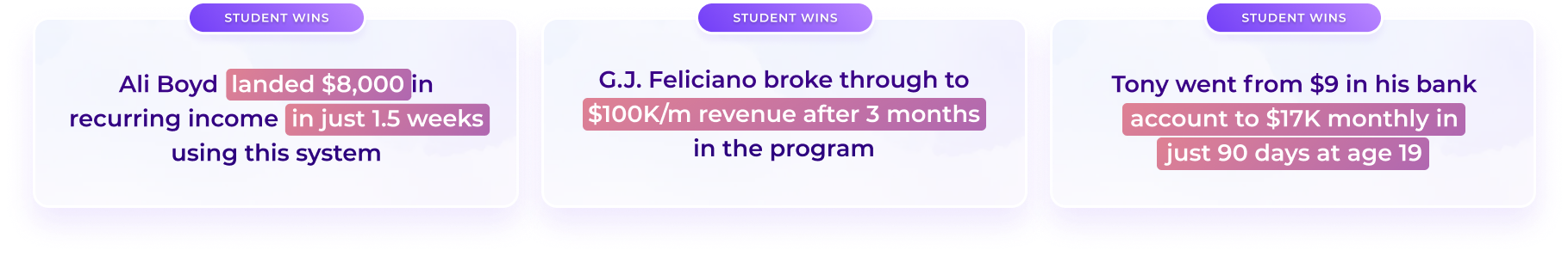 Based on our members' results, many users secure their first client within their first couple weeks of using our system. For example, Jared Mcnally went from living in a moldy basement with his last $3,500 to his name, to landing his first two clients within 2 weeks of joining. Within 6 weeks, he had 8 clients generating $12,000 monthly recurring revenue.