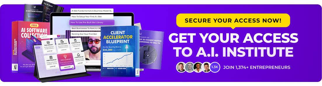 Try the AI Institute for a full 60 days. Access our complete bot library, setup these A.I. bots for local businesses, and watch business owners happily pay you month after month while the bots do all the work.